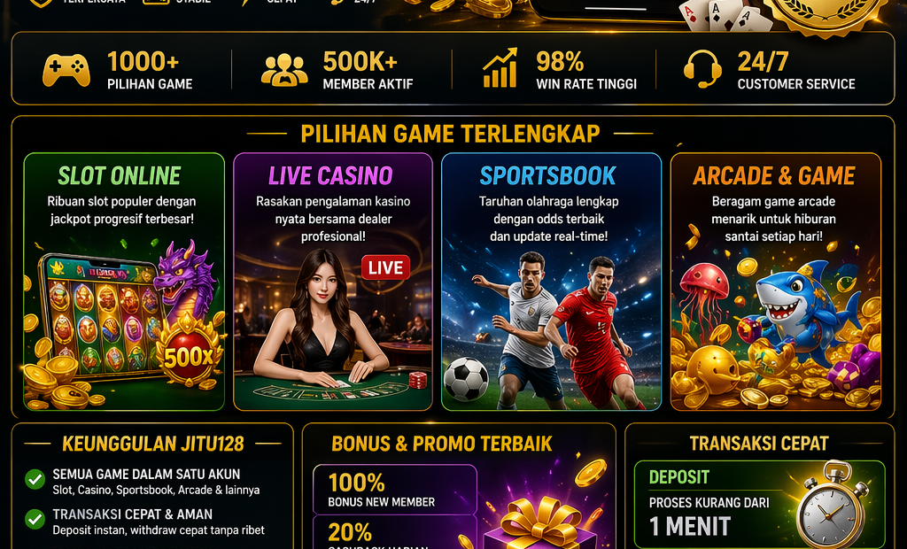 JITU128 menawarkan ratusan hingga ribuan pilihan game dari berbagai provider ternama. Mulai dari slot populer hingga permainan live casino tersedia dalam satu akun.